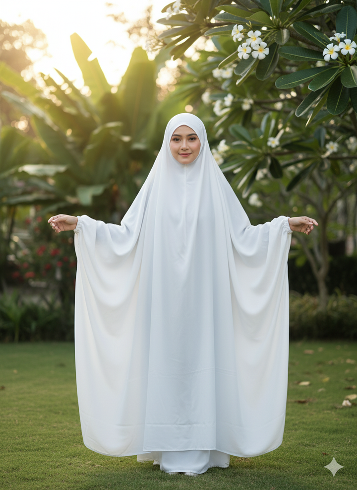 The khimar is a traditional Islamic garment worn by Muslim women for modesty purposes. It is a loose-fitting outer garment that covers the head, hair, neck, and shoulders, extending down to varying lengths, often reaching to the waist or beyond. The khimar is usually worn over regular clothing and can come in various styles, colors, and materials to suit different cultural preferences and personal tastes. It is a symbol of religious identity and modesty, serving as a means for Muslim women to adhere to Islamic dress guidelines while expressing their individuality and cultural heritage.